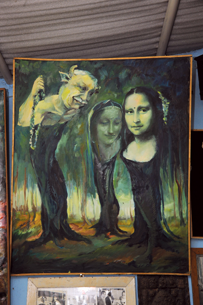 His ego? Well, it is a fact that many, if not all, of his works have wide (wild) eyed - some very much devilish - faces of the artist himself. One painting in particular is especially interesting. It shows the artist painting a full length nude figure of Venus (‘Boticelli’s Venus’, he informs). The artist’s silver hair is twisted at the sides to resemble horns and he has a gleeful look on his face. In short, he seems to be really enjoying himself! A couple of other paintings have Mona Lisa (some ethnically clad) as a central figure. What’s this obsession with ML (mysterious lady)? Well, there’s a tale behind this too.