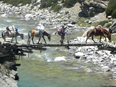 Mules and Uncle crossing the Tankchhe Khola