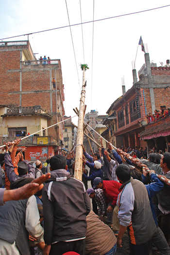 Most locals believe that the pole is raised in honor of Kamalasan Vishnu, yet scant supporting evidence can be found in myths or scriptures. The raising of the lingo, much like in the Bisket Jatra in Bhaktapur and Indra Jatra in Kathmandu, is raised in front of an ancient palace or seat of power. The ceremonial raising of the lingo symbolically plays out the role of Handigaun as an ancient capital, reasserting its importance to the state and reenergizing the settlement for another year. It also acts as an invitation to the people and the gods to partake in the festival of renewal; a call that is answered emphatically every year.