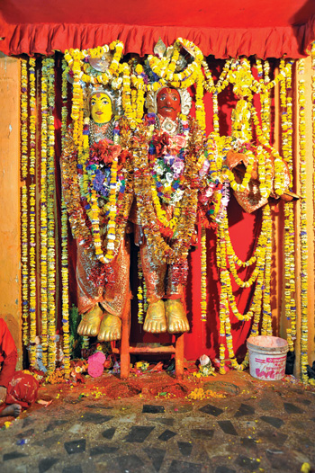 Infuriated, the holy man instigated an eagle to swoop down and take away their only child. The couple, mustering all their previous religious karma, took to the skies after the bird. At this moment, the child revealed his true form — Vishnu astride the Garuda— and bestowed upon his worldly parents divine status and freed them from the cycle of life and death. A seemingly happy ending that explains the unusual placement of BhatBhateni who remain suspended at their temple, their feet never touching the ground.