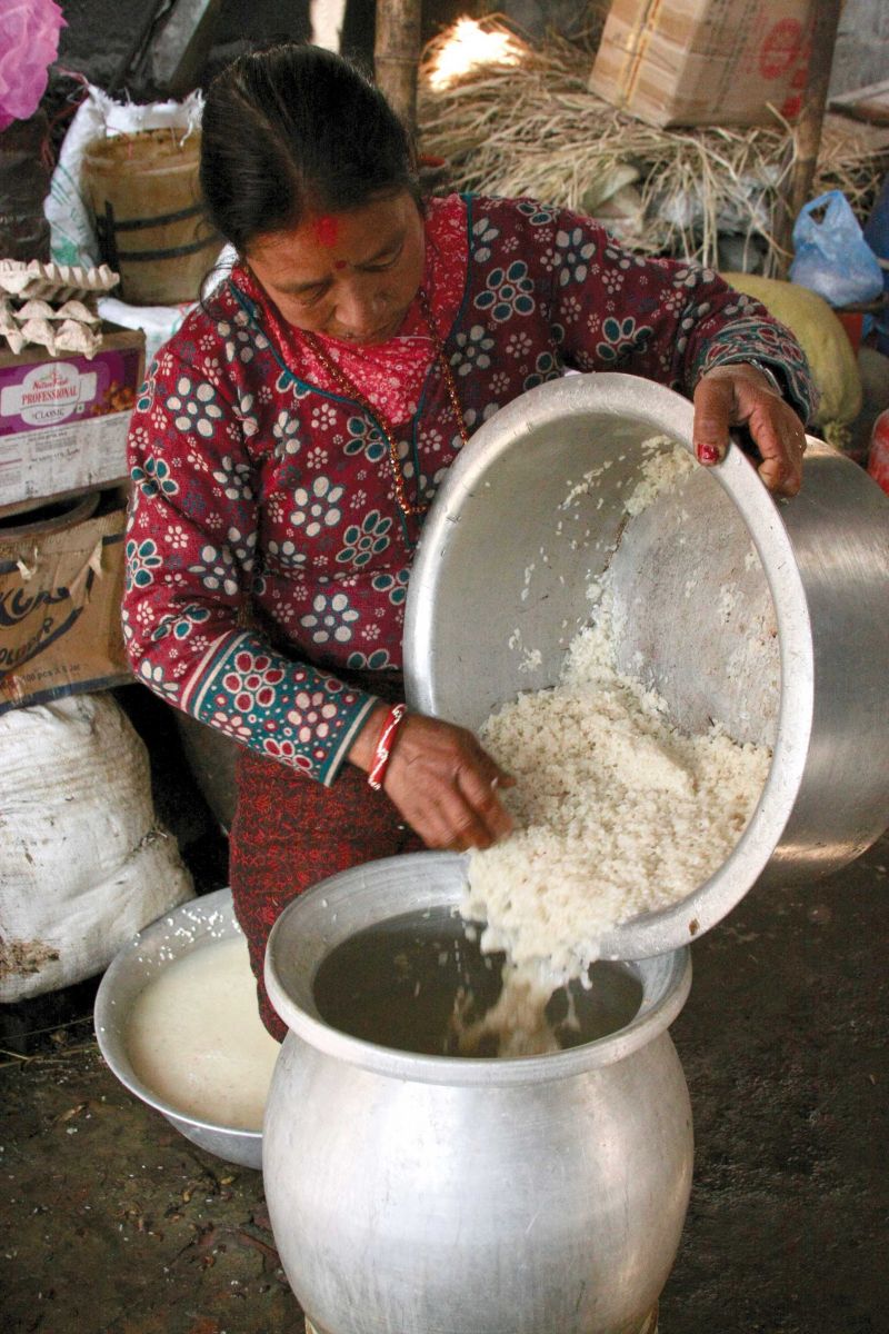 At Lahana, a group of four skilled and experienced Newari women prepare thon with much delight and pleasure. Thon is one of Newari cultures most treasured drinks, so the women at Lahana prepare it with high precision to bring out the optimum taste. The weeklong process of making thon starts with soaking the key ingredient, rice. The women at Lahana do not use just any type of rice; they use a special type of taichin chamal (sticky rice) to make the sweet chhyang. The soaked rice is then steamed in a special type of pot with holes below it. When half cooked, the rice is again washed and then steamed until it’s fully cooked and prepared for further processes.