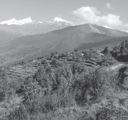 Today, rough seasonal roads crisscross the hills, but back then there were no motor roads and few settlements. Throughout their two-day march up the ridge Baudha “hovered intermittently above the northern mists” – a scene, he says, which “encouraged the sahibs, somewhat daunted the coolies, and cheered the Sherpas.” It was also a challenge, for the expedition was rapidly running out of food. And though they met a few woodsmen and villagers on the way up, they were not able to buy any food. Their last hope settled on the one last little village, high up on the ridge –