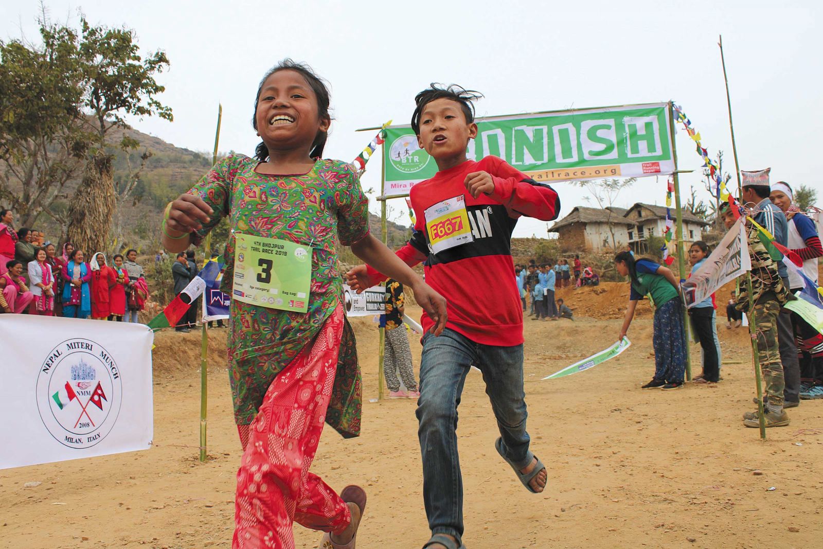 potential for trail athletes in Nepal. That’s why it was possible to work with a shared vision. We have also started working on organizing races in really remote regions of Nepal, where commercial races couldn’t reach, as we think rural Nepal has more surprising talents if we make trail racing accessible there. In February 2019, we conducted the 36 km Bhojpur Trail Race in Mira Rai’s own village in eastern Nepal, and we were stunned with the performance of the kids there. The winners in the male category won with an impressive timing of 3 hours and 31 minutes and 3 hours 42 minutes, in a race that climbs up about 2600 m in 36 kilometers. That, my friend, is a really tough course!