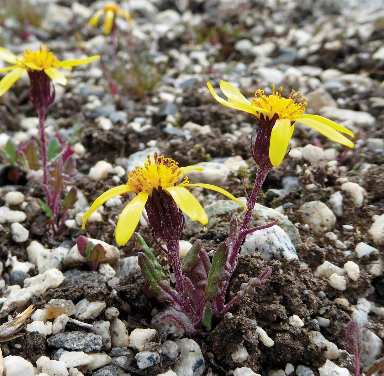 Senecio albopurpureus Kitam., Scree ragwort (Ngozumpa Glacier, 17 August 2017) This highly fragrant yellow flower has long underground stems (rhizomes) that put out lateral shoots and allow it to hold on to the shifting substrate.
