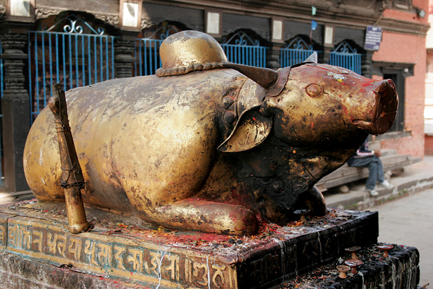 Similarly, Lord Shiva, the creator and destroyer, has the bull Nandi as his vehicle and the largest image of Nandi can be found in the Pashupati temple, one of the holiest Hindu shrines. This massive statue of the vehicle is gilded and sits facing the shrine of Shiva. Unfortunately, no photography is allowed within the temple premises, so we have to be content with a picture of a more humble likeness of Nandi.