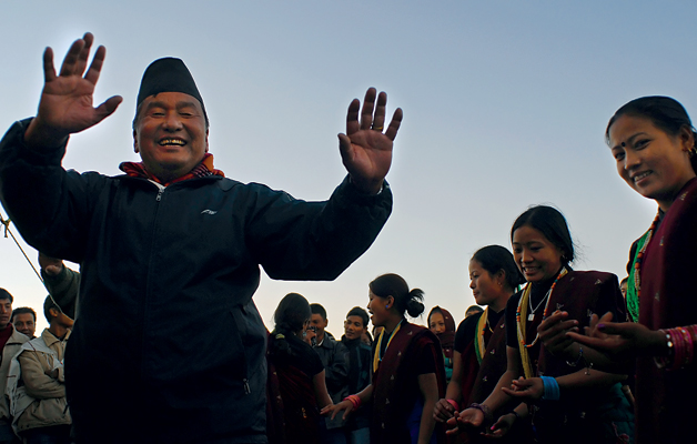 Losar is a big celebration for Gurungs. Ganjasingh Gurung, Director of the Tamu Samaj (Gurung Society), joined a troupe of Tanahu District dancers during the celebration. He highlighted the significance of choosing this day for marking the New Year celebration. Poush 15 marks the end of winter and start of spring and it is traditionally celebrated for three days including a banbhoj (picnic). In the first two days, various sporting events took place including competition for prizes handed out on the third day. There were numerous stalls of food and drink, and happy dohori singing and dancing on a special stage. A group of men competed in a tug-of-war rope pulling contest, young and old, all in it for the fun.
