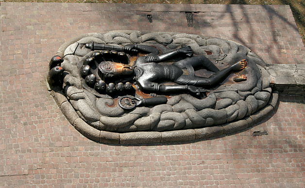 Unlike the sleeping Vishnu of Budanilkantha, the one at the Hanuman Dhoka has no water surrounding it, and looks isolated. The design however, does suggest that it was meant to have water around it. Lying on a bed of Nagas, the image is much smaller than the original. At some distance is the image of a garuda, Vishnu’s vehicle paying homage.