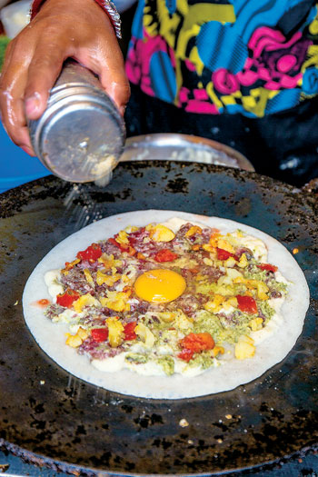 As I walked towards Swotha tole from Mangalbazar, I saw many craft shops and their owners chilling outside, with wide smiles and talks of the elections. Being a Newar, I could understand what they were talking about, and so I couldn’t stop overhearing one shopkeeper describe the khuwa ko yomari that an eatery nearby served. I couldn’t grasp all the details he was sharing, however, I did catch hold of the name of the shop—Nandini Eatery Shop. So, I called up my friends right then and there, and lured them to come have yomaris with the same enthusiasm and with the same confidence as the man who I overhead describing it. I hit the right spot, and my friends agreed to come. While I waited for them to arrive, I sipped a glass of sugary tea at the same place and had a conversation with the lady cook of the eatery. She smiled widely as I asked her some rookie questions about the food. Even though I could recognize some dishes, there were many items that I had never seen or heard of.