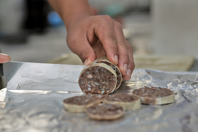 The mixture is then stuffed into a pig’s intestine that has been preserved in salt, and flushed through clean water. Once this is done, the casing is tied at both ends, and then cooked in water for about an hour in moderate heat. The sausages will float to the surface when they’re fully cooked.