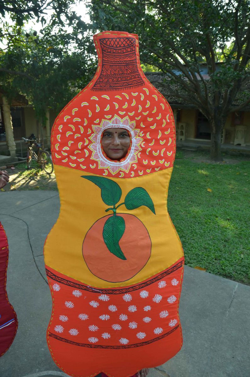 Susie has been a costumier with the Royal Shakespeare Company and the English National Opera. She works with the JWDC sewing section to make the base of each costume, and then the artists paint onto the fabric. Each costume becomes a work of art. The bottles of Sprite, Coke, and Fanta are covered with Maithil decorations, and yet recognizable as the popular beverages found everywhere in local shops.