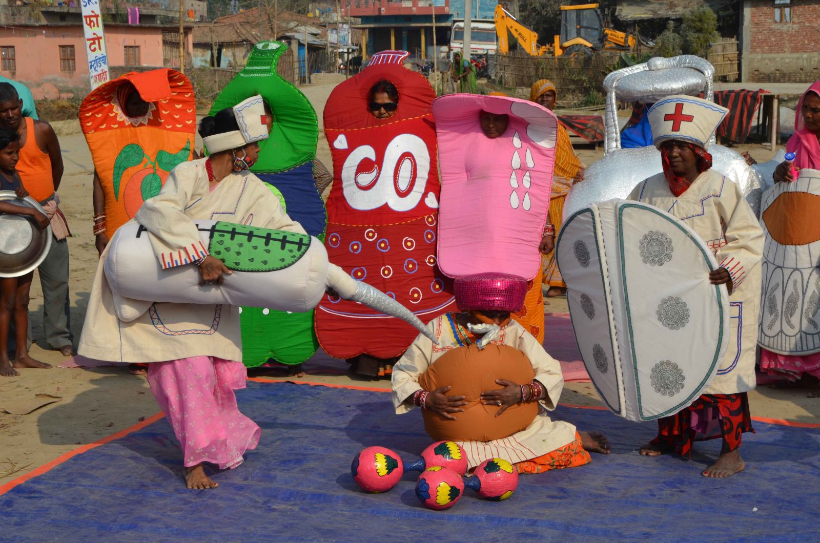 Hundreds of people are led in exercise routines and singing songs, hundreds of children have their faces painted with vegetable motifs. The children try on a carrot costume or have their photos taken in the “head in the hole” boards painted by the artists. Students compete in toss games, and crowds form to view the drama. Nothing like this has ever happened before. The artists are joyful as they send out their health messages through their own Maithil art and their own Maithili language.