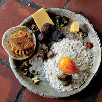 This bwo, once served, is followed by a variety of items – different eatable parts of animals such as the buffalo and the duck, egg, fish as well as various other vegetable curries. Normally, there are up to 22 items that are served at one sitting but on occasions such as weddings and rice-feeding ceremonies there are 84 varieties served. This is termed as ‘Chaurasi Byanjan’ in Nepali meaning, a meal with 84 items. In Newari, this is commonly called the thaybhu and this is served in a bronze plate elevated with a stand to signify its utmost importance.