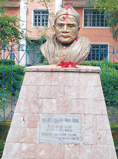 He started the country’s first cottage textile industry at the Shankhamul Ghat in Lalitpur. In 1927, he established the Shree Tin Chandra Kamdhenu Charkha Pracharak Mahaguthi and the Nepal Gandhi Smarak Nidhi, which later merged in 1973 to become the Nepal Charkha Pracharak Gandhi Smarak Mahaguthi. In 1977, Tulsi Mehar received the Nehru Award in recognition for his social service. He donated the award money to establish a training and rehabilitation center for widowed and destitute women from various parts of Nepal. Here they were given vocational training to develop new skills that would enable them to transform their sad and hopeless lives. The center is known as the Tulsi Mehar Mahila Ashram.