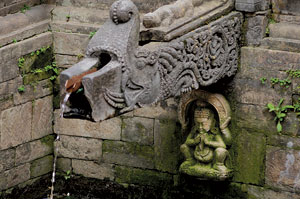 Take a walk down the steps of the ancient stone water fountains (Dhunge dharas) of Kathmandu and take a closer look at the stone image of Bhagirath just below the water spout. In the Kathmandu valley, the principle source of fresh water in the urban areas has been stone water fountains known as gaa hiti in Newari and gairi dhara in Nepali. The spouts themselves are excellent pieces of art carved in stone (dhunge) and/or covered or cast in metal and gilded (sun dhara). According to Hindu mythology, Bhagirath was a great sage who walked the earth when it was covered in “ash and dust”. He prayed and practiced great austerity to appease the gods to bring Ganga, the goddess of the river Ganges, to heal the earth. The gods agreed but realized that the descent of the great river could threaten and damage all beings on earth. A plan was devised to therefore let the river first fall on Lord Shiva’s head as he meditated on Mount Kailash. Upon landing on Lord Shiva’s head, the Ganges split into seven different streams and finally flowed down to the surface of the earth.
