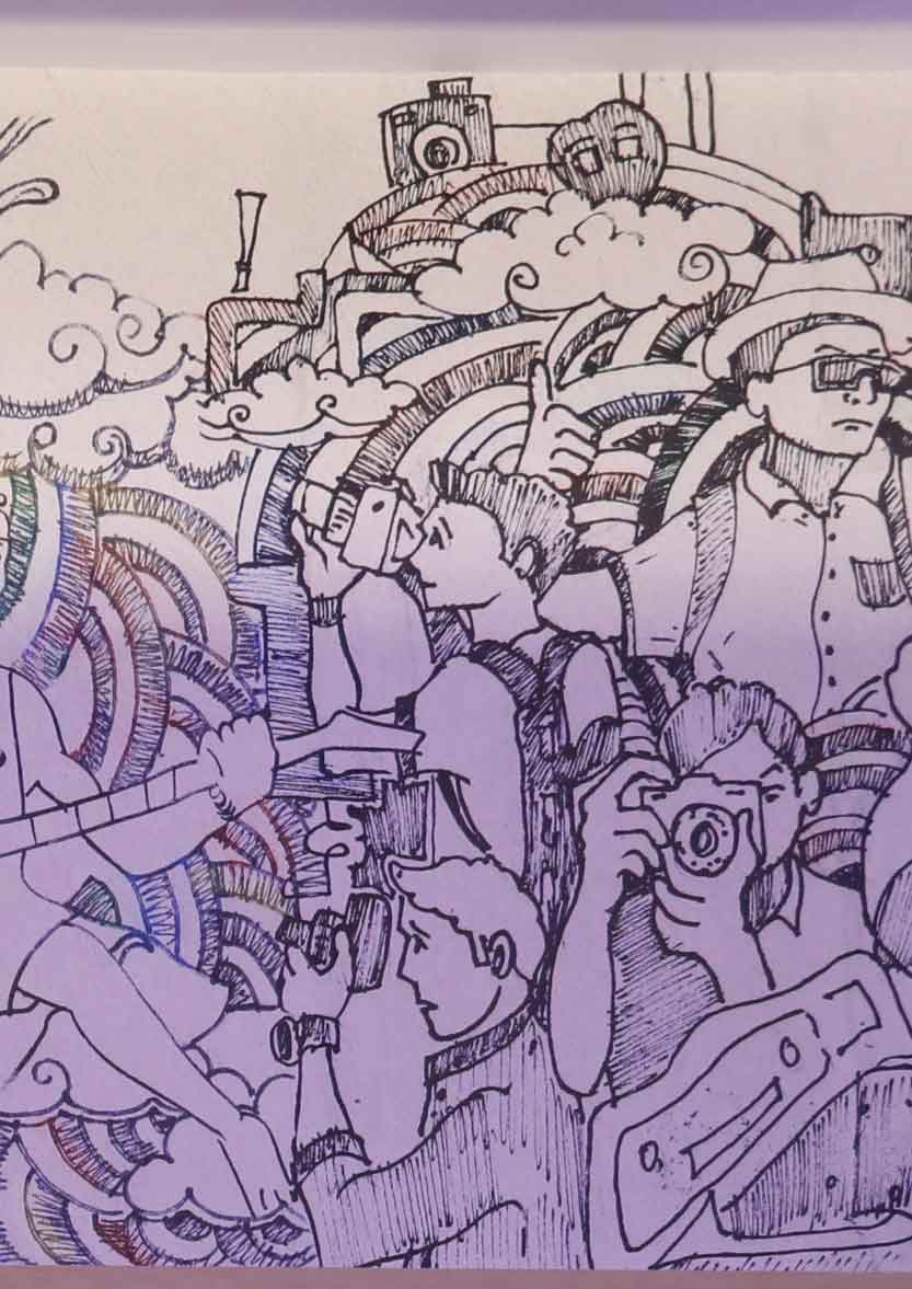He explored various styles and options for painting on the wall—photo-finish, 3D—and finally selected the sketchy drawing style. Something that is a very reflective impression of Thamel itself. Thamel being ever-evolving, nothing looks perfectly finished here; the incompleteness of its physical and cultural landscape was the inspiration behind the sketchy style. The whole process took about three-four months, with the help of three visual artists, Anil Shahi, Saroj Tui, and Avinash Malla, to transform the concept into visual compositions. Through minimal use of color, the mural stands out in the space and does not blend with the ambience, and captures the changing socio-cultural dynamics, culturally, along with the physical landscape.