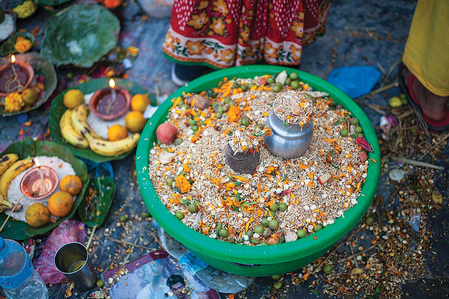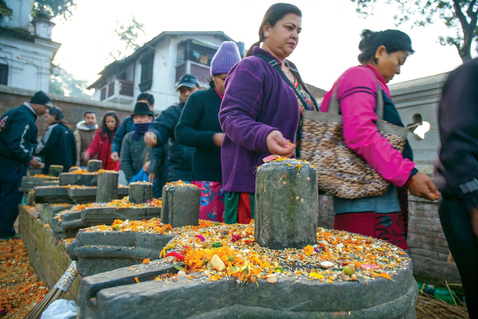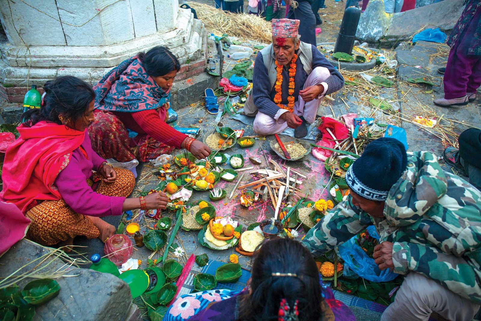 As the legend tells us, this festival is observed for the salvation of the soul of the deceased. People who have lost a family or relative in that year gather at the Pashupati Temple Complex the eve before the festival. They light oil lamps and chant mantras and prayers for The salvation of the souls of their departed. Thousands of people gather here for this, and The collective light is said to brighten and illuminate the path of the restless spirits to Heaven. People wait till dawn tending to their lamps, and at the break of dawn, they take a Dip in the holy Bagmati River and set out to offer the sat-bij to the various smaller temples And images of deities in and around the Pashupati Temple complex. The offering of sat-bij Is made from the recently harvested summer crop, and as per Hindu tradition, a small Portion of every fresh harvest is first offered to the gods.