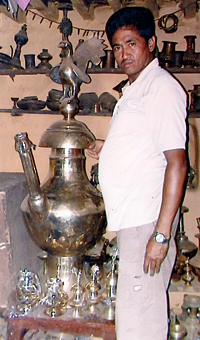 Suresh Man Bajracharya runs the ‘Palpali Karuwa Udyhog’ in Tansen, Palpa, a picturesque little hill station like town in western Nepal. This town is famous for many things, for instance, the Tansen Durbar around which the town is built, and which was razed to the ground by the Maoists in January 2006, in what could be compared to an act of defilement similar to that of the Taliban’s destruction of the colossal 6th century Buddha statues in Bamiyan, Afghanistan, on March 2001. A five minute walk from the durbar is located another famous landmark, the so called Taksar Tole (Taksal Ward). This where one will find a number of shops displaying a variety of metal crafts that have given Tansen a reputation as a town of skilled metal smiths. Most of the metal works are either those that are used for everyday use in Newari households, or for religious ceremonies. Beside Magars, Tansen is a city primarily inhabited by Newar migrants from the Kathmandu valley who just don’t seem to be able to stop practicing their fabled craftsmanship skills wherever they go!