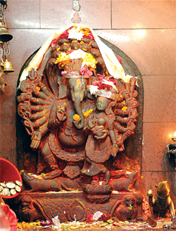 Another oddity is that he has one hand wrapped around Siddhi, the elder of his two wives, she being the elder sister to Riddhi, his other wife. This, too, is something quite uncommon. But, whatever the reason for this, it is a local belief that if you are suffering from one too many marital squabbles, a dozen or so laddus (round sweetmeats that Ganesh has a special fondness for) and a fervent prayer here will help you more than any marriage counselor ever could. Knowing this, you can come to your own conclusion about the symbolic aspect of Ganesh holding his first wife at this temple.