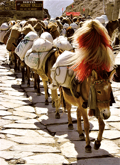 Jomosom. Another 1.5 hour walk north is Jomsom, the district town. The trail and motor road take you along the west bank of the river to the Jomosom Airport and to the hotels and shops that line the main street of this relatively new community. Early travelers knew only old Jomosom, on the river’s east bank. Today, the old town has a few guesthouses, school, temple, and government offices. When Maurice Herzog arrived there in 1950, the old town looked much as it had for centuries, with its old style houses and caravansaries. The French climbers had been walking many days up from the Indian border through the Nepal hills, following the long-established pilgrim trail. On reaching Thak Khola they were impressed by the geographic and climatic differences. At Jomosom, Herzog wrote that “Little by little the look of the country changed; it became far more desolate even than the regions we had just left. Northward the contours were softer; hills covered with reddish colored stones, a new luminosity in the atmosphere, and a growing feeling of desert country, showed beyond all doubt that we were approaching Tibet, though the frontier was a good day’s march from this point.”