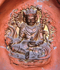 We entered the cave on small steps cut/worn into the stone. It was very dusty, dark, and steep. You could definitely take a tumble with a misstep. We ascended up past rock formations and circled around to the right. There are mani (prayer) inscriptions carved on the walls, some painted tankas (scroll paintings), and face-like projections stained black from handprints. The rock formations resemble stalagmites and stalactites. There are also several small chortens made of clay with white painted features, and a large clay panel with tens of imbedded gold images.