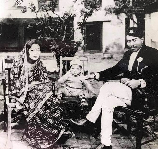 Photo of Dharma Bhakta, with his wife Uttara and daughter Renu at Ombahal, Kathmandu (c. 1938).