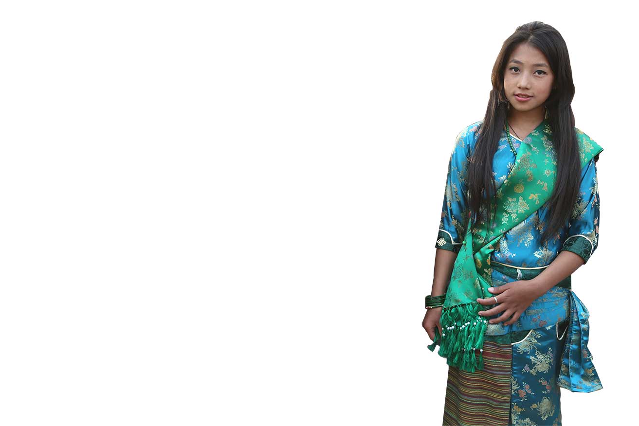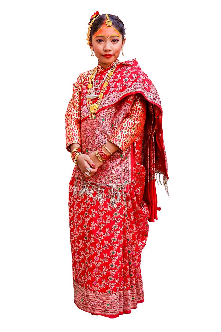 Now, this is something that turns a girl into the cutest version of themselves. A Dhaka blouse with different geometrical patterns, a patuki wrapped around the waist, and a colorful skirt below are combined to complete this dress code. It is worn as regular attire in rural areas, but in case of Kathmandu, you can see girls and women dancing in it at cultural ceremonies.