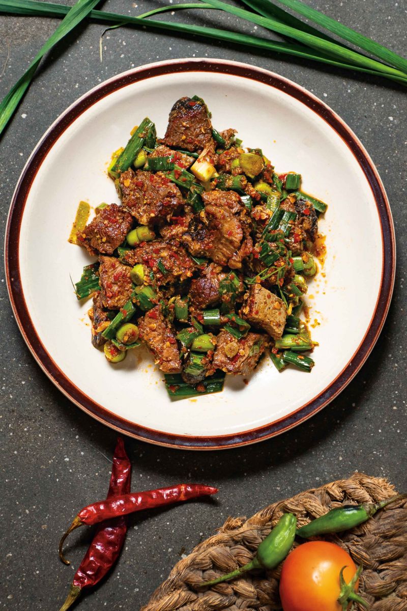 Traditionally, chhoila is made by roasting buffalo meat in an open fire made from hay. As only the tender part of meat is used, the hay fire quickly chars the meat on the outside, leaving it medium rare on the inside. The individualistic style of the making of chhoila, and assortment of all the lovely seeds and spices—cumin, cardamom, turmeric, pepper, and chilli—is what’s striking about the flavor. The sharp taste of chhoila literally hits your taste-buds, and the chewy and tender texture makes it a flavorsome, spicy, lip-smacking appetizer.